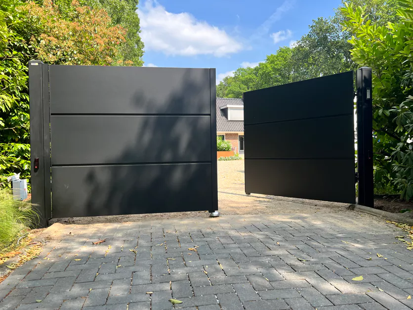 - Twee poortpalen: 120x120x3, 120x120x6, 160x160x4 afhankelijk van de afmeting van de poort.